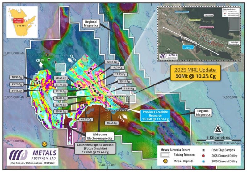 At the heart of this optimism is the company’s Lac Carheil graphite project in Quebec, Canada, which has rapidly advanced into Metals Australia’s flagship asset. The project now boasts an updated mineral resource of 50 million tonnes (Mt) grading 10.2 percent total graphitic carbon (TGC), containing 5.1 Mt of graphite, placing it among a select group of high-grade, large-scale deposits globally