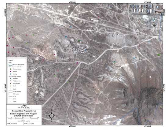 Andrew Pollard, Blackrock's President and Chief Executive Officer, stated: "Initial assays from our Eastern Expansion Program have returned both high-grades and broad zones of shallow silver and gold intercepts potentially extending up to 1,200 metres along trend from the DPB South Resource shell. At the historic Ohio mine area on the eastern margin of Tonopah West, hole TXC25-166 intersected 5.03 metres grading 750 g/t AgEq, offsetting the mineralized structure first identified in RC hole TW25-128, which returned two 1.52 metres zones grading 1,198 g/t Ag and 9.61 g/t Au starting at 292.6 metres and 219 g/t Ag and 1.72 g/t Au starting at 297.2 metres earlier this year. Thick zones of mineralization, spanning between 5.67 to 8.75 metres were encountered in drillholes TXC25-164 and TXC25-159 just east of the existing DPB South resource area, situated in close proximity to our planned exploration decline. As our geologic model continues to advance along the outer ring of the fraction caldera, and with assays pending from an additional 13 drillholes under the Program, this emerging zone represents significant tonnage potential that can meaningfully expand the Tonopah West mineral resource base stemming from the edge of DPB South zone through to the eastern boundary of Tonopah West."