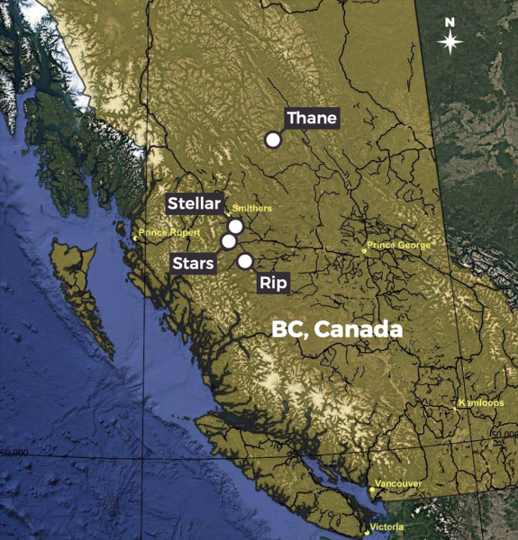 In British Columbia, the company’s assets include the Stars copper-molybdenum discovery in the Bulkley Porphyry Belt, the Stellar property with historic showings and new anomalies, an earn-in on the Rip project, a large porphyry copper-molybdenum system, and the Thane Project in the Toodoggone Belt, prospective for copper-gold-molybdenum.