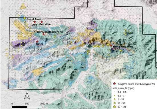 Figure 1: Location of the mines and prospects in the Three Musketeers Tungsten District with W in soils.