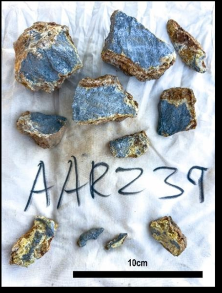 Figure 3: Sample of oxidised massive stibnite float (AAR239). The sample assayed 34.3% Sb. Refer to Table 1 for full analytical details.