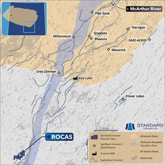 Figure 1. Regional map of Standard Uranium's Rocas Project. The Project is located 75 kilometres southwest of the Key Lake Mine and Mill facilities along Highway 914.
