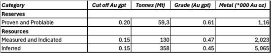 - Contained within the Historical Measured and Indicated Resource Inventory is a Historical Mineral of 1.16M oz Au in the Proven & Probable Category of 59.3Mt at 0.61 Au grams per tonne (at a cutoff grade of 0.20 Au grams per tonne)